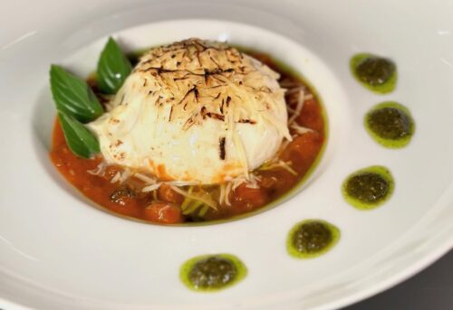 Queijo cremoso artesanal maçaricado, servido com molho de tomate italiano ao toque de manjericão, acompanhado de torradas rústicas de fermentação natural.