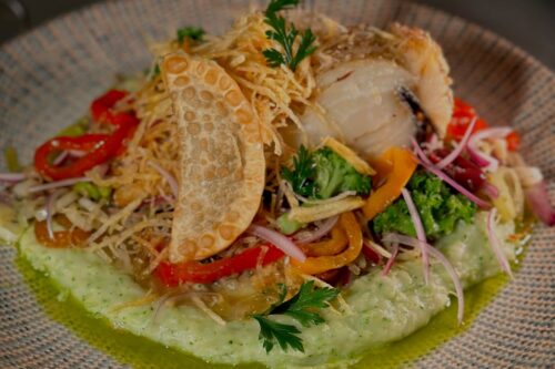 Frutos do mar (camarões, mexilhões, anéis de lula e tentáculos de polvo) salteados no azeite cítrico, acompanhados de risoto parmegiano ao toque de limão siciliano e cubos de maçã verde, finalizado com picles de mostarda.