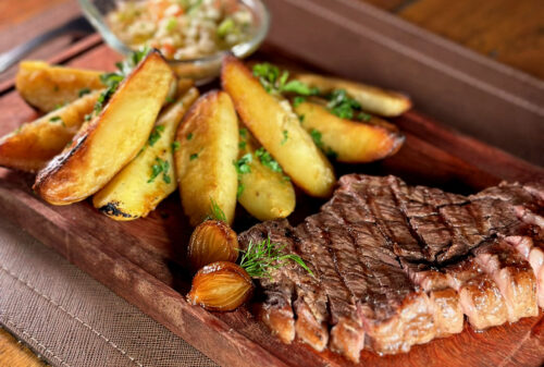 Churrasco à moda AA Wine Experience. Fraldinha grelhada com batatas palito artesanais, vinagrete de maçã verde, farofa de cebola roxa e bacon, ketchup de goiabada cascão e pão de alho gratinado.
