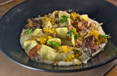 Ravioli recheado de abóbora ao creme de amêndoas, nozes caramelizadas, tomates baby confitados e mix de